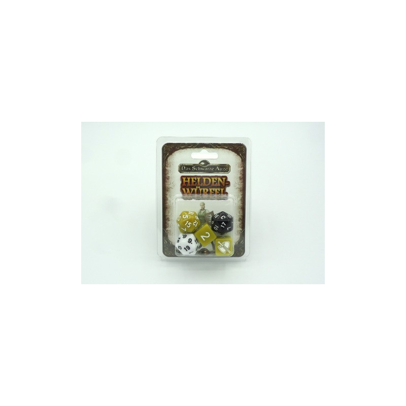 Das Krieger-Würfelset enthält drei zwanzigseitige und zwei sechsseitige Würfel, die du zum Spielen von „Das Schwarze Auge“ verwenden kannst. Einer der zwanzigseitigen Würfel ist in Gelb gehalten, die anderen beiden sind schwarz. Die sechsseitigen Würfel zeigen statt der Zahl 6 ein Krieger-Symbol.