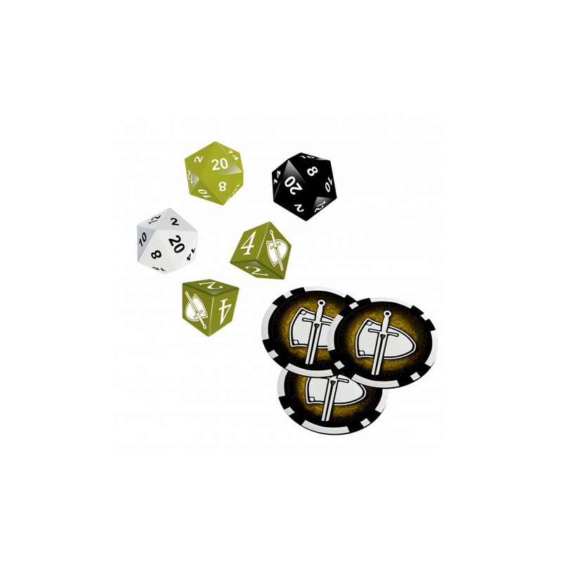 Das Krieger-Würfelset enthält drei zwanzigseitige und zwei sechsseitige Würfel, die du zum Spielen von Das Schwarze Auge verwenden kannst. Einer der zwanzigseitigen Würfel ist in Gelb gehalten, die anderen beiden sind schwarz bzw. weiß. Die sechsseitigen Würfel zeigen statt der Zahl 6 ein Krieger-Symbol. Das Set enthält zudem drei Schicksalspunkte. Mittels Schips kann dein Held die gefährlichsten Situationen überstehen, in denen manch anderer den sicheren Tod gefunden hätte, und nicht selten sind sie das Zünglein an der Waage, wenn es darum geht, heldenhafte Taten zu vollbringen