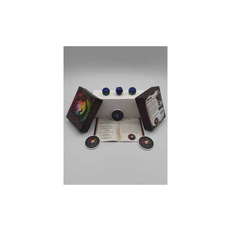 Die Mächte des Schicksals beeinflussen die Entscheidungen von Helden maßgeblich und können der ausschlaggebende Grund für ihren Erfolg oder ihr Scheitern sein. Dieses Set enthält 3 Schicksalspunkte mit dem Symbol der Gottheit, einen Götter- und einen Kha-Würfel, einen zwanzigseitigen Würfel sowie eine Anleitung zur Nutzung des Spielmaterials für eine Fokusrege zum Thema Schicksalspunkte.