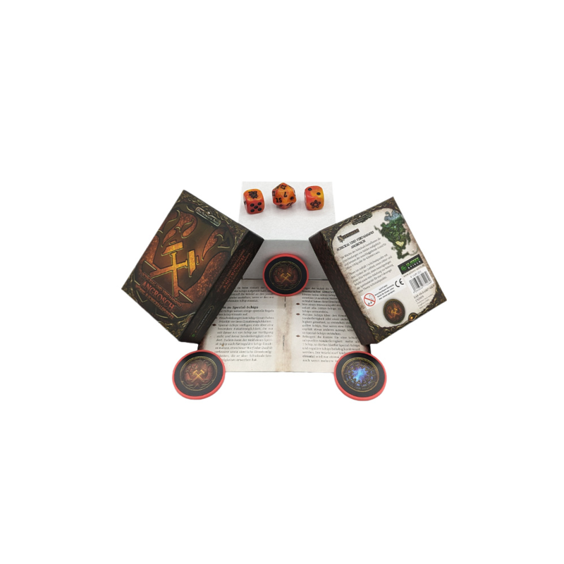 Dieses Set enthält 3 Schicksalspunkte mit dem Symbol der Gottheit, einen Götter- und einen Kha-Würfel, einen zwanzigseitigen Würfel sowie eine Anleitung zur Nutzung des Spielmaterials für eine Fokusregel zum Thema Schicksalspunkte.
