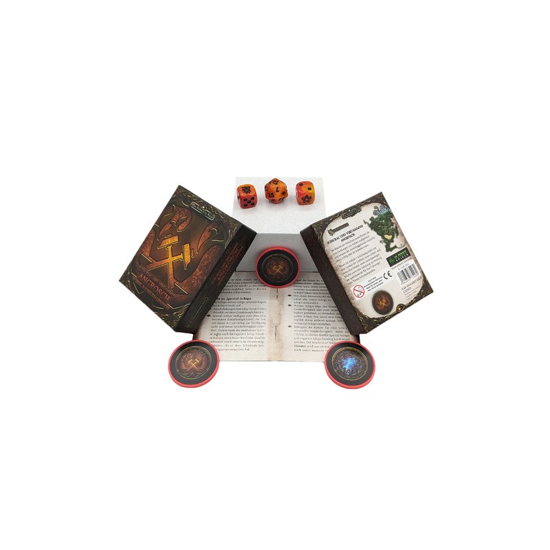 SCHICKSAL UND VERDAMMNIS ANGROSCH Die Mächte des Schicksals beeinflussen die Entscheidungen von Helden maßgeblich und können der ausschlaggebende Grund für ihren Erfolg oder ihr Scheitern sein. Dieses Set enthält 3 Schicksalspunkte mit dem Symbol der Gottheit, einen Götter- und einen Kha-Würfel, einen zwanzigseitigen Würfel sowie eine Anleitung zur Nutzung des Spielmaterials für eine Fokusregel zum Thema Schicksalspunkte.