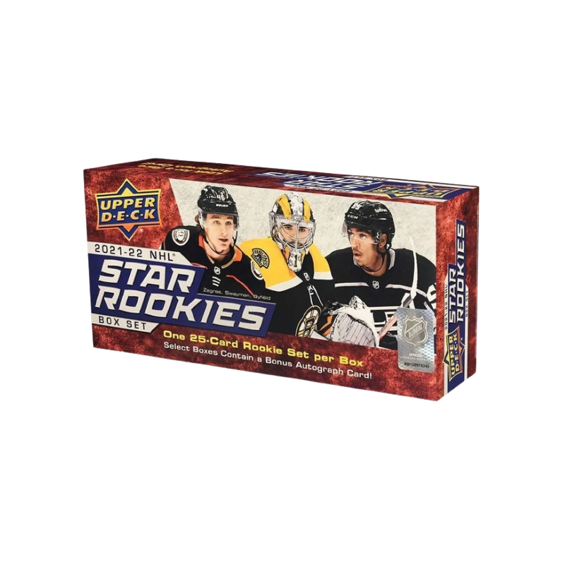 Die neueste Ausgabe des NHL® Star Rookies Box Set versammelt die besten Nachwuchsspieler der Saison 2021-22. Dieses besondere Set ist eine willkommene Ergänzung für jede Sammlung, und glückliche Kunden erhalten außerdem eine seltene Autogrammkarte! Jede Box enthält das komplette 25-Karten-Set. Eine Box pro Fall enthält im Durchschnitt eine 26. Bonuskarte - eine seltene Rookie-Autogrammkarte!