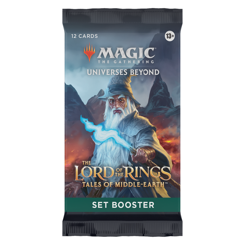 Ein Der Herr der Ringe: Geschichten aus Mittelerde Set-Booster-Display enthält 30 Der Herr der Ringe: Geschichten aus Mittelerde Set-Booster und 1 Box-Topper-Karte als traditionelle Foilkarte. Jeder Set-Booster enthält 12 Magic-Karten, 1 Artwork-Karte und 1 Spielstein-/Werbekarte, Hilfekarte oder Karte aus „der Liste“ (eine besondere Karte aus der Geschichte von Magic – in 25 % der Booster).