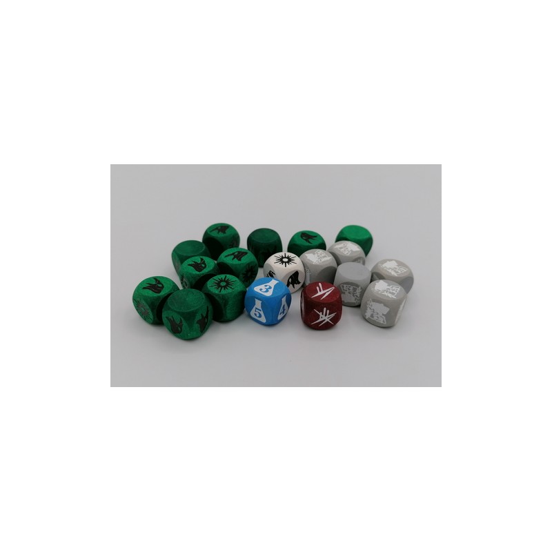 Das Set enthält 18 speziell für HeXXen 1733 angefertigte sechsseitige Holzwürfel. 10 HeXXen-Würfel werden zur Bestimmung von Erfolgen und zum Aktivieren von Esprit-Kräften genutzt, 5 Januswürfel stellen Boni und Mali dar und jeweils ein Blut-, Segnungs- und Elixierwürfel entscheiden über die Wirksamkeit von Zuständen und besonderen Jägerkräften.