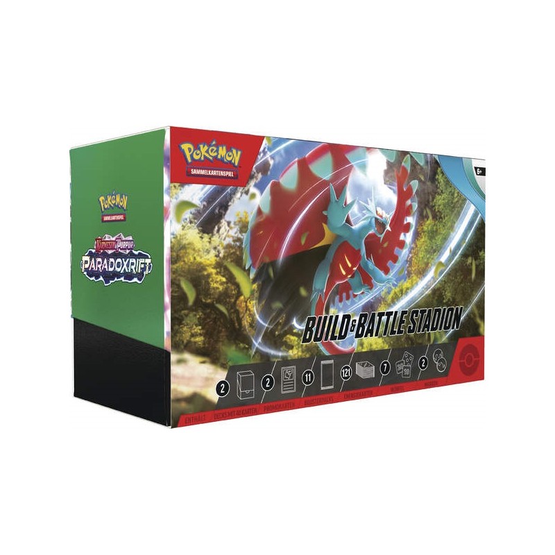 Dieses Build & Battle Stadion der Pokémon-Sammelkartenspiel-Erweiterung Karmesin & Purpur – Paradoxrift enthält ein umfangreiches Kartenset, einschließlich zweier Build & Battle Boxen.
