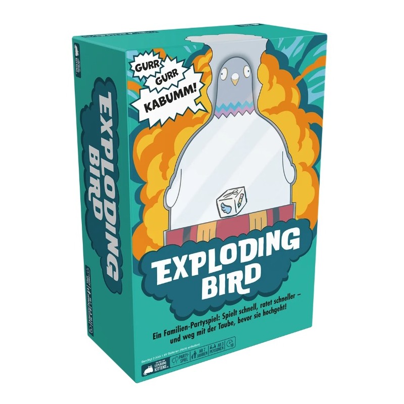 Im Familien-Partyspiel Exploding Bird müsst ihr schnell in Teams gegeneinander spielen und noch schneller raten – und bloß weg mit der Taube, bevor sie hochgeht!
