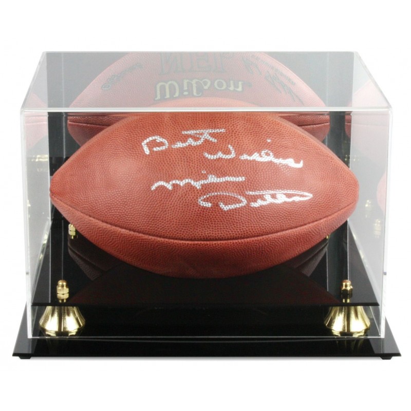 The BCW Deluxe Acrylic Football Display Case features a black base with gold risers, clear cover, and a mirrored back. Use this sports memorabilia holder to protect, store and display your collectible footballs from the NFL, NCAA, high school and others.