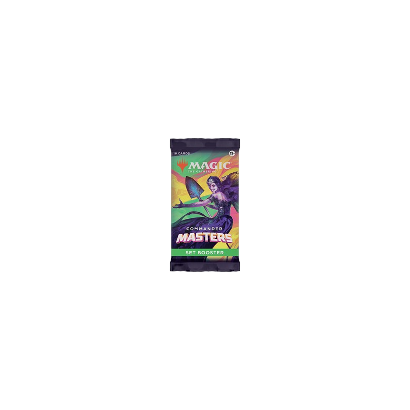 Dieses Commander Masters Set-Booster-Display enthält 24 Commander Masters Set-Booster. Jeder Set-Booster enthält 15 Magic-Karten, 1 Artwork-Karte und 1 Spielstein-/Werbekarte oder Karte aus „der Liste“ (eine besondere Karte aus der Geschichte von Magic – in 25 % der Booster), darunter 2-6 Karten der Seltenheit selten oder höher (2: 34 %; 3: 48 %, 4: 15 %, 5: 2 %, 6: < 1 %), 3-8 nicht ganz so häufige, 4-8 häufige und 1 Länderkarte. Jeder Booster enthält mindestens 1 traditionelle Foilkarte beliebiger Seltenheit. In 20 % der Set-Booster ersetzt ein traditionelles Foil-Land das Standardland, und in 10 % der Set-Booster ist statt der Artwork-Karte eine Signatur-Artwork-Karte mit Foil-Stempel enthalten. In 1 % der Booster ist eine sagenhaft seltene Karte als traditionelle Foilkarte ohne Rand enthalten.