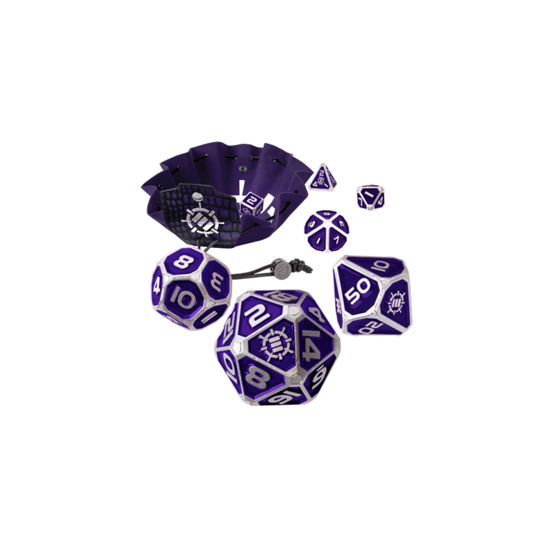 The Collector's Edition 7pc Metal Dice Set includes all the necessary dice used in most TTRPG’s so you are prepared when your fate hangs on the roll. The dice feature a gunmetal grey finish and are beautifully enameled with a color treatment for a thematic tie in with powerful chromatic dragons. To ensure your character is prepared for battle, the dice come with a 2-in-1 Dragon Satchel (vegan leather) that transforms from a gorgeous drawstring dice bag to an unfolded dice arena that protects gaming surfaces when rolling hefty metal dice.