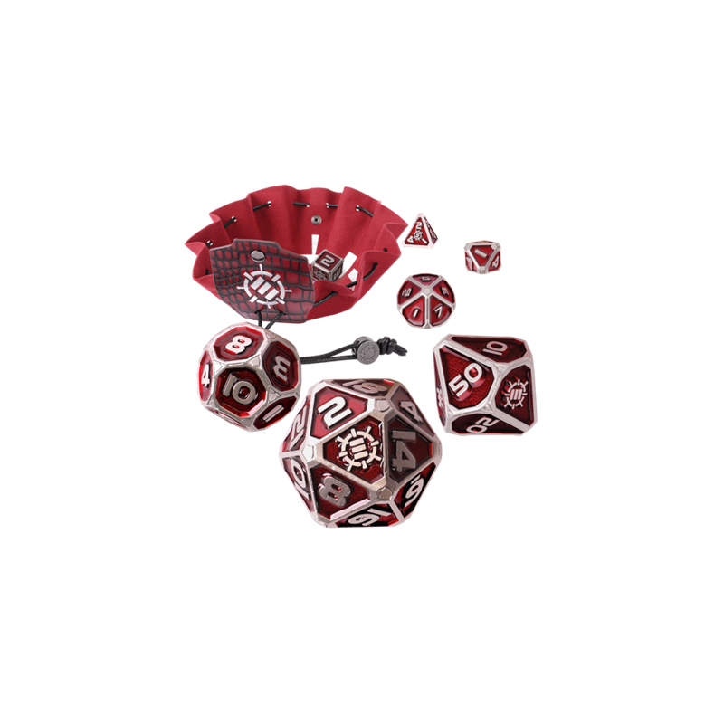 The Collector's Edition 7pc Metal Dice Set includes all the necessary dice used in most TTRPG’s so you are prepared when your fate hangs on the roll. The dice feature a gunmetal grey finish and are beautifully enameled with a color treatment for a thematic tie in with powerful chromatic dragons. To ensure your character is prepared for battle, the dice come with a 2-in-1 Dragon Satchel (vegan leather) that transforms from a gorgeous drawstring dice bag to an unfolded dice arena that protects gaming surfaces when rolling hefty metal dice.