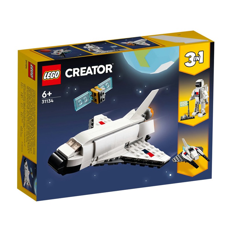 Weltraumabenteurer ab 6 Jahren werden das LEGO® Creator Spaceshuttle (31134) lieben. Dieses 3-in-1-Spielset beinhaltet ein Spaceshuttle mit aufklappbarer Luke, hinter der sich ein Satellit an einem ausfahrbaren Arm befindet. Der Satellit kann zum Spielen vom Arm abgenommen werden. Dieses LEGO Creator 3-in-1-Set bietet Weltraumfans 3 verschiedene Bau- und Spielerlebnisse. Dein Kind kann erst das Spaceshuttle bauen und die Raumfähre dann in einen beweglichen Astronauten mit Raketenrucksack und aufstellbarer Flagge oder in ein imposantes Raumschiff verwandeln.