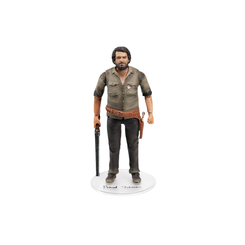 Die offiziell lizenzierte Actionfigur von Bud Spencer wurde inspiriert durch seine Rolle als Bambino ("Der Kleine") aus dem Klassiker "Die rechte und die linke Hand des Teufels". Die 18 cm große Figur verfügt über 14 Bewegungspunkte und wird mit weiterem Zubehör in einer Fensterbox mit Hänger geliefert. Ein transparenter Standfuß mit aufgedruckter Signatur verhilft Bambino zu einem sicheren Stand und ein wendbares, beidseitig bedrucktes Diorama sorgt für eine ansprechende Präsentation der Figur, wahlweise vor Wüsten- oder Westernstadt-Hintergrund.