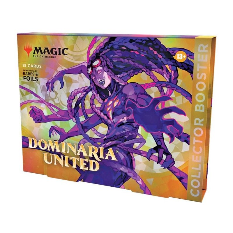 The Dominaria United Collector Booster Omega Pack contains 15 Magic: The Gathering cards and 1 Traditional Foil double-sided token, with a combination of 5–6 cards of rarity Rare or higher and 4–5 Uncommon, 4 Common, and 1 Land cards, with a total of 10–13 foil cards. Foil Borderless Mythic Rare Planeswalker in 2% of boosters