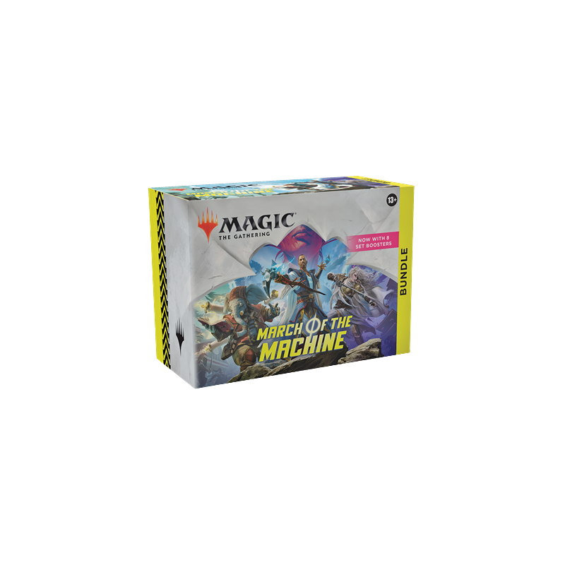 Das March of the Machine Bundle enthält 8 March of the Machine Set Booster - die besten Booster, die man nur zum Spaß öffnen kann - plus Zubehör, mit 1 traditionellen Foil-Alternate-Art-Promokarte, 40 Basisländern (20 traditionelle Foils und 20 Non-Foils), 1 übergroßen Spindown-Lebenszähler, 1 Kartenaufbewahrungsbox und 2 Referenzkarten.
