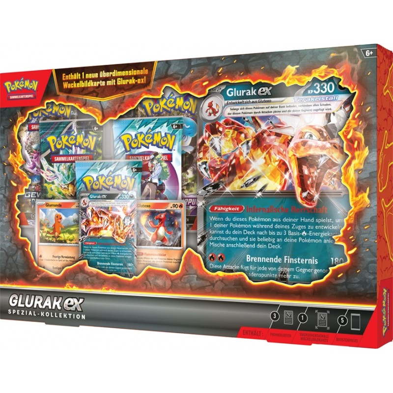 Glurak-ex äschert die Führung deines Gegners mit der listigen Feuerkraft eines Finsternis-Pokémon ein! Entwickle es aus Glumanda und Glutexo und setze dann seine starke Fähigkeit und mächtige Attacke ein, um ein tosendes Comeback zu feiern. Dieses feurige Set enthält 5 Boosterpacks des Pokémon-Sammelkartenspiels und eine überdimensionale Wackelbildkarte mit dem Flammen-Pokémon selbst. Bewege die Karte hin und her, um Glurak-ex in Aktion zu sehen!