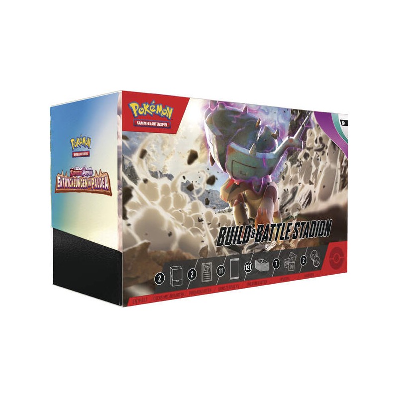 Jedes Build & Battle Stadion der Pokémon-Sammelkartenspiel-Erweiterung Karmesin & Purpur – Entwicklungen in Paldea enthält ein umfangreiches Kartenset, einschließlich zwei Build & Battle Boxen, eine für dich und eine für einen Freund. Jede Build & Battle Box enthält vier Boosterpacks und ein Deck mit 40 Karten, das eine exklusive holografische Karte enthält.