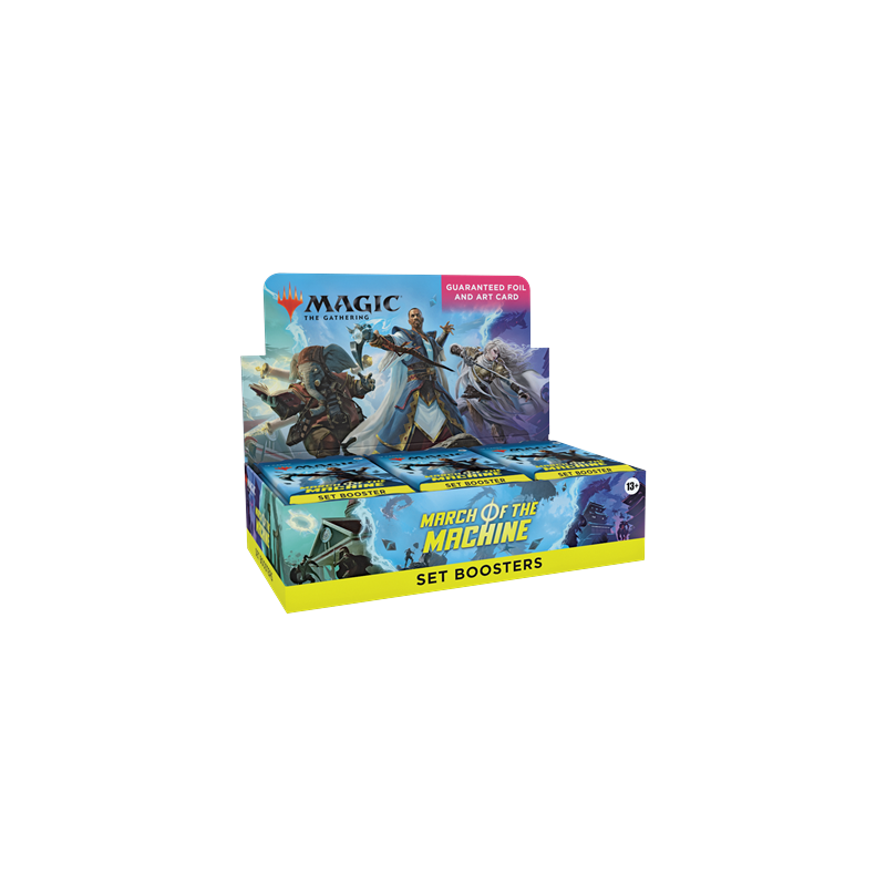 Die March of the Machine Set Booster Box enthält 30 March of the Machine Set Booster. Jeder Set-Booster enthält 12 Magic-Karten, 1 Kunstkarte und 1 Token/Werbekarte, Helferkarte oder Karte von "The List" (eine besondere Karte aus der Geschichte von Magic, die in 25% der Packs zu finden ist).